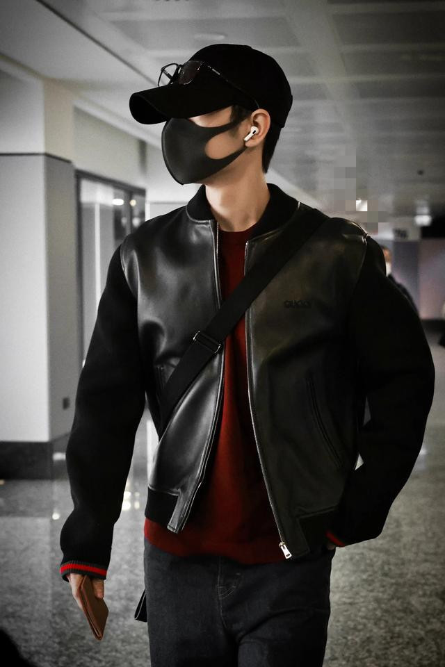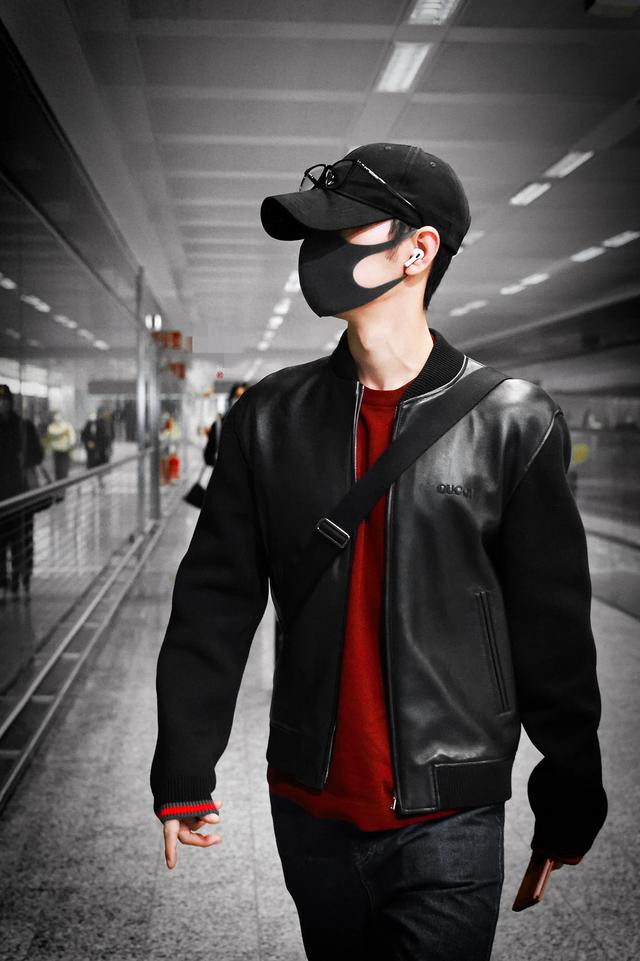 肖战抵达米兰, 黑色皮衣下内搭正红色T恤, 带着中国年味就来了